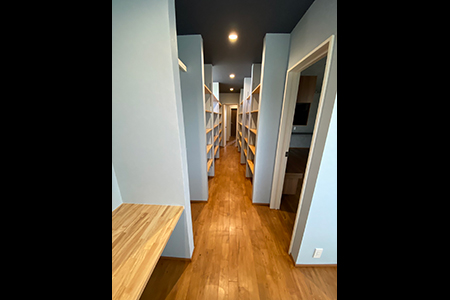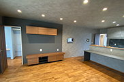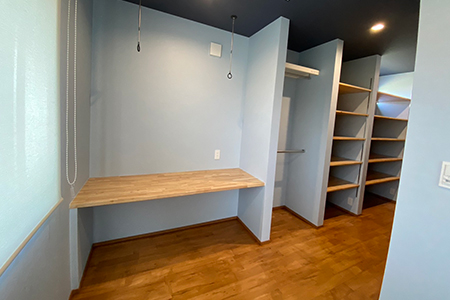 無垢材を使用した床は、素足での触れ心地がよく、お家の中が温かい雰囲気に包まれます。お部屋によって異なるクロスは、家族ひとりひとりのこだわりが詰まった空間に。洗濯場、ランドリールーム、ウッドデッキが一直線で、スムーズな家事動線の間取りもポイントです!