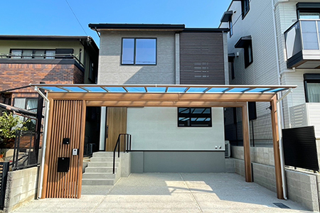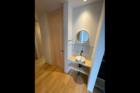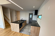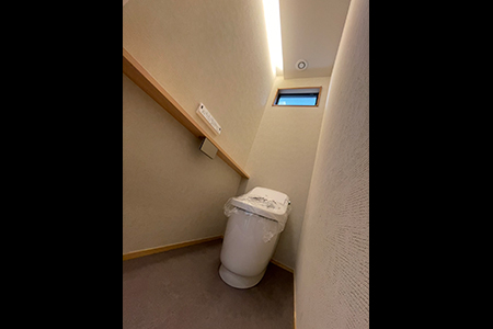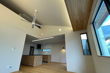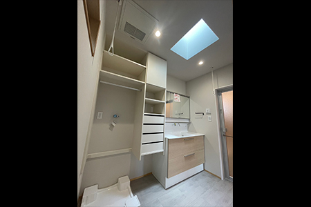 勾配天井の吹き抜けと小屋裏を繋げ、開放感のあるリビングに。下げ天井のアクセントには木板を使用し、間接照明にすることで、より素敵な雰囲気を味わえます。天窓から自然光が差しこむ洗面脱衣室には、システム収納と大きな化粧台を設置し、明るく使い勝手のよい空間に仕上げました。また、LIXILの【建て得】サービスを採用し、太陽光発電システムを設置しました。