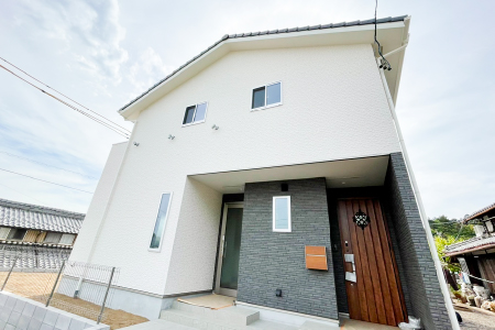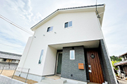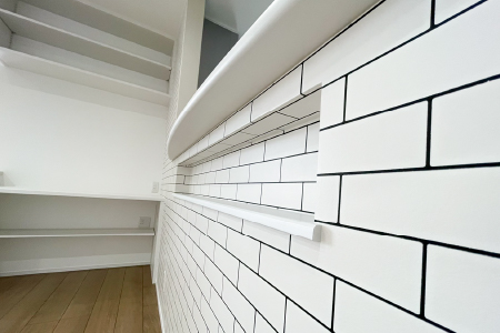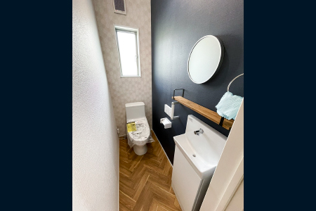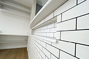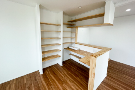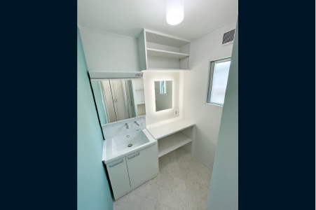 店舗併用住宅の受付には、造作カウンターを設置。LDKにも、ちょっとした作業ができる造作カウンターを。洗面室にはメイクアップミラーを取り付けています。