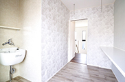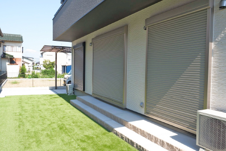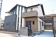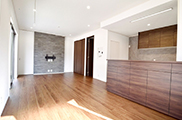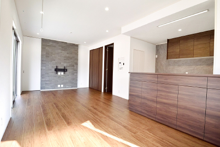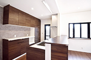 キッチンに大収納のカップボードを、さらに前面には収納カウンターを設け、存在感ある空間に。洗濯効率をUPさせるため、家事スペースには作業カウンターとスロップシンクを設置しています。