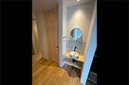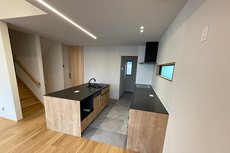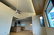 勾配天井の吹き抜けと小屋裏を繋げ、開放感のあるリビングに。下げ天井のアクセントには木板を使用し、間接照明にすることで、より素敵な雰囲気を味わえます。天窓から自然光が差しこむ洗面脱衣室には、システム収納と大きな化粧台を設置し、明るく使い勝手のよい空間に仕上げました。また、LIXILの【建て得】サービスを採用し、太陽光発電システムを設置しました。